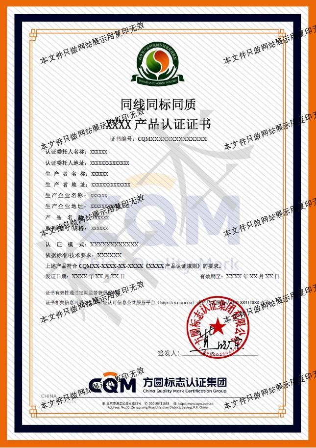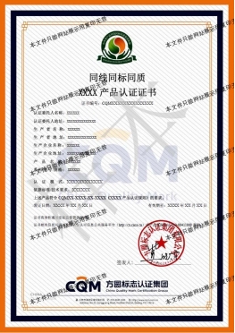 為加強對方圓自愿性產(chǎn)品認(rèn)證標(biāo)志的管理,確保產(chǎn)品認(rèn)證標(biāo)志的正確使用,維護產(chǎn)品認(rèn)證標(biāo)志的權(quán)威性和CQM的信譽,方圓標(biāo)志認(rèn)證集團依據(jù)國家認(rèn)證認(rèn)可的相關(guān)要求制定了產(chǎn)品認(rèn)證標(biāo)志使用規(guī)范。標(biāo)志基本樣式:
